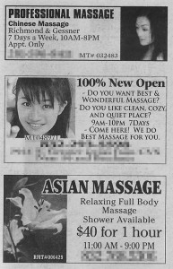 Every week, ads like this are featured in Houston Press that contain subtle language which indicate sexual services are offered. Stock photos of Asian women are re-used for different ‘massage parlors’.