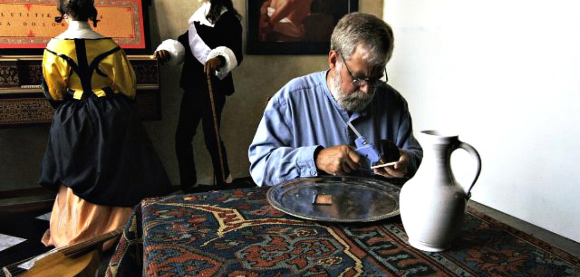 Tim was intrigued by the photorealistic qualities of the painting of Johannes Vermeer. Also of interest were books that postulated theories on how Vermeer used optics to paint – Philip Steadman’s “Vermeer’s Camera” and David Hockney’s “Secret Knowledge.” Both Steadman and Hockney appear in “Tim’s Vermeer.”