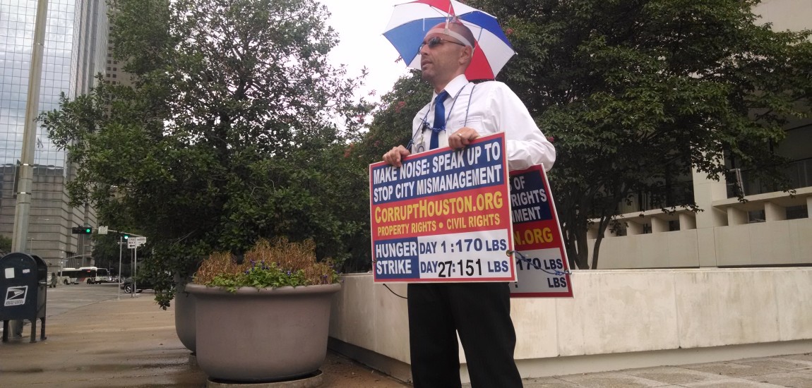 Nizini doesn’t look so good. He’s spent more than 25 days on hunger strike protesting in front of city hall. He tells any passerby who will listen that Houston is corrupt. That it needs to change. That minorities are in danger.