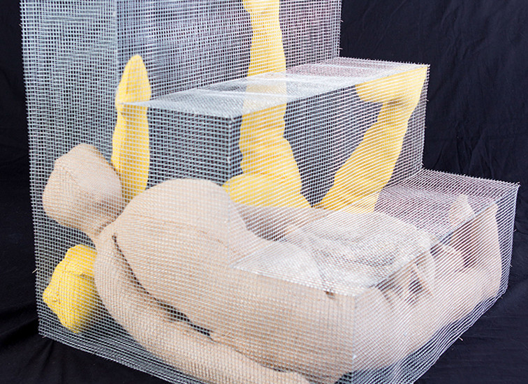 Specifically, this idea of healing or handling issues made me think of your piece “A Self Divided” – fabric bodies trapped inside mesh stairs. While beforehand it appeared darker to me, you mentioned that it had more to do with stepping over yourself or not letting yourself get in your own way. Did you find that sculpting this piece helped you accomplish that?