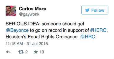 On Monday, Carlos Maza, the LGBT Program Director of Media Matters, published a blog on the Huffington Post arguing that Beyoncé could help stop discrimination in her hometown by supporting HERO.