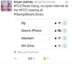 Wait, what? Consumers? That might have been the single most-used word through the whole session. “Consumers.” To the FCC and their panel, we’re all just a mindless mob of passive zombies, not “producers” of blogs and videos and , not “citizens” in a democracy. Just “consumers” demanding more bandwidth for our Netflix and our Hulu.