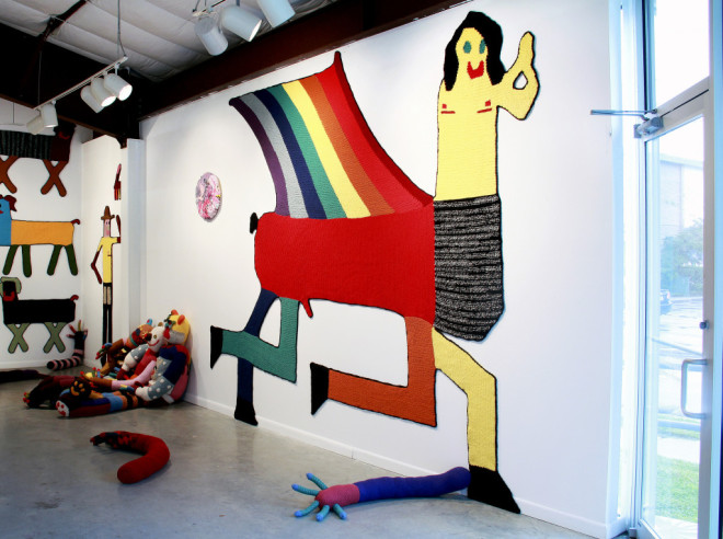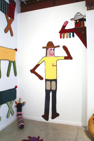 It’s a happy space, and it’s fun to see (and roll around on the ground with) the pillowy forms that are scattered across the floor of ALH’s Front Gallery. Chandler’s crocheted works sit like child-like drawings on the galleries’ walls. They smile and they wave, playfully exploring themes of desire and identity.