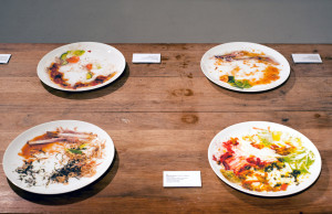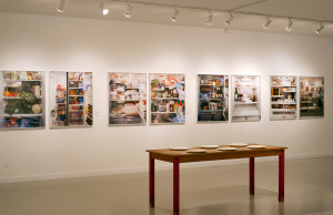 Behind Sillers’s lush, thriving containerful of vitality looms Nolan Calisch’s series of photographs of weekly “food shares” from three different Community Supported Agriculture co-ops (or CSAs) in Brenham, Portland, and Fairbanks, Alaska. CSAs have been gaining popularity over the past decade, and provide a way for small-scale farmers to connect with urban “consumers” in a symbiotic relationship that seems much healthier and more sustainable than big time agribusiness. The photos, taken weekly over a six-week period, depict the changing seasons through their bountiful harvests, and in a stark contrast to Emily Peacock’s photographs of highly refined and processed “food products,” the veggies show traces of the soil that produced them. Even the arrangement of the vegetables — on reusable tote bags and cloth blankets spread right on the earth they are made from — suggests wholesome strength, vitality, and fertility. The viewer can smell the rich soil, and prints of the photographs are displayed near the bottom of the installation in a way that resembles seed packet displays, and, in a gesture that points to the Earth’s abundance as depicted in the photos, viewers are invited to take a photo print — a seed to plant in her consciousness, to guide her own feeding choices.