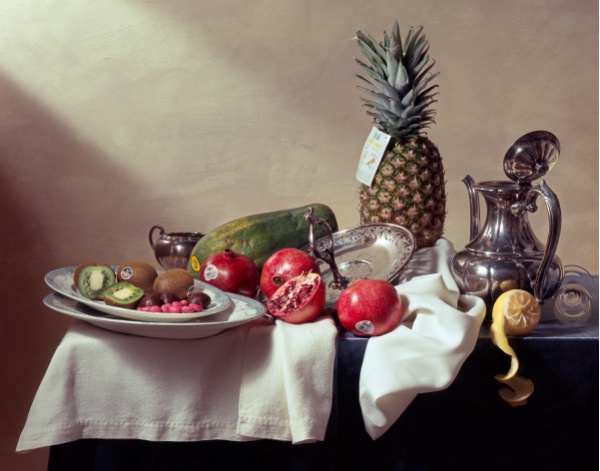 What the old masters did with oil paints, however, Maciejewski does with machines (camera, computer, printer), and his titles are as hilarious as his photos are beautifully composed, focused, printed. By leaving the tags, stickers, brands, and bar codes of mass-market global commerce on these living objects made of soil and water and sunshine, Maciejewski forces the viewer to acknowledge her disconnect from nature and the ecological unsustainability — not to mention inferiority in both taste and nutritional value — of this petroleum-heavy corporate food production and distribution system. These are not fruits and vegetables, these are “agricultural products,” and the viewer is not a “human,” is not a living, breathing participant in a living, breathing ecosystem, but is a “consumer,” instead.