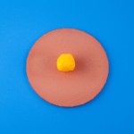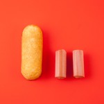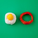“What the hell is that?” the viewer is forced to ask, looking at odd colored circles and spheres against bright backgrounds. The question works on many levels: first, looking at an image of a cheese puff on top of a slice of bologna, the viewer has to figure out that it is indeed a cheese puff on top of a slice of ham, but that then begs the questions, “What the hell is a cheese puff? What goes in them? What is taken out of whole foods to make these processed things? How do they make that color? Are there any harmful byproducts? Are the workers in the factory treated well? And what does this do to my insides?”