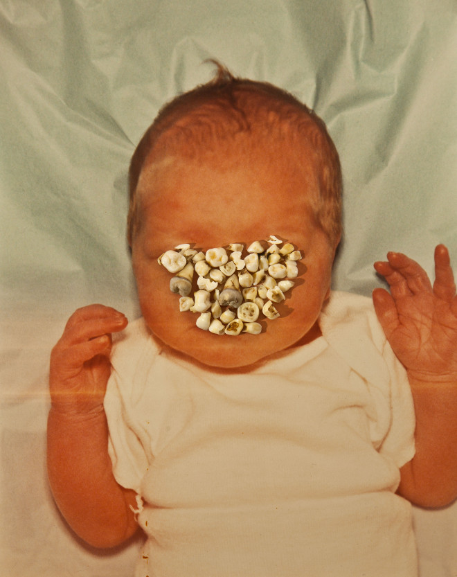 “I definitely knew that I wanted to use the family photographs, and when I made the first image of my baby teeth, I knew I was on to something.” While experimenting with these objects, a timeline develops that shows her comfort with physically altering these formerly precious memories growing. The placement of her own baby teeth and the toenails over the initial photos in the series is done with a level of precision that denotes the sentimental attachment she must have felt when first deciding the photos would be her subject. As the series progresses, this composed hesitation is replaced with bolder moves in sweeps and spills of paint.